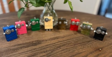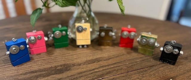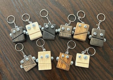 Each Robot Keychain is unique and handmade by Shawn, himself. You can order them with a Wood Stain or Painted Color. Each Robots eyes, ears and mouth are unique as well.
